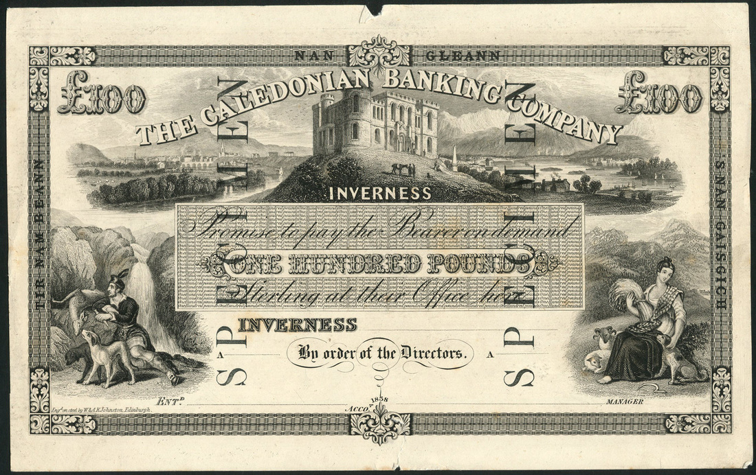 Caledonian Banking Company, proof £100 on card, ND (ca 1863), black and white, view of Inverness with the castle and the river Ness top centre, allegorical male figure at left, maiden (Abundance) low right, value in black circular frame top left and right, plate A, reverse, blue and white, arms