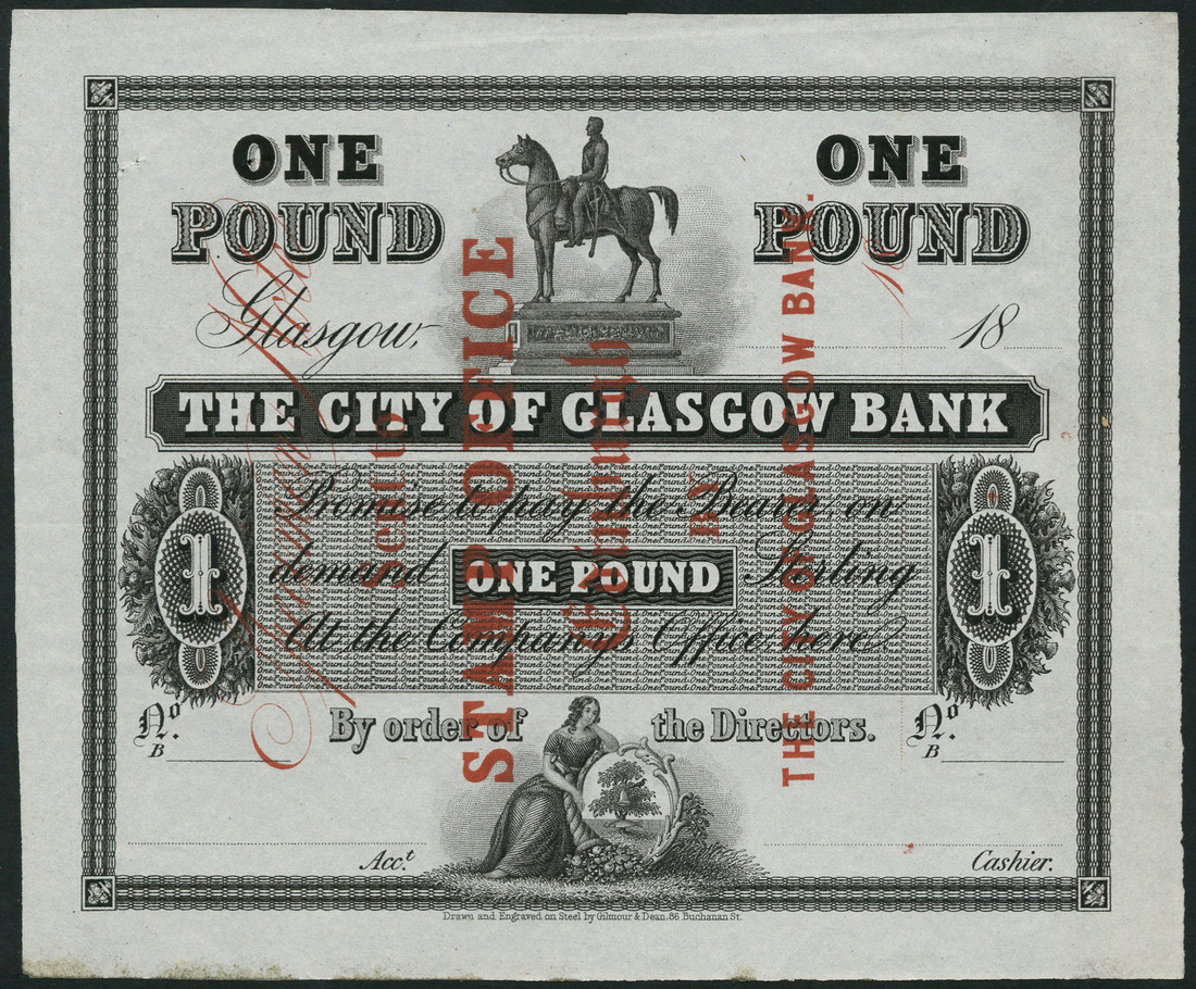 (Douglas 1), red 'SPECIMEN NOTE SENT TO STAMP OFFICE, EDINBURGH, BY THE CITY OF GLASGOW BANK' overprint, glue residue in margin, staple holes, otherwise extremely fine, exceptionally rare in this condition