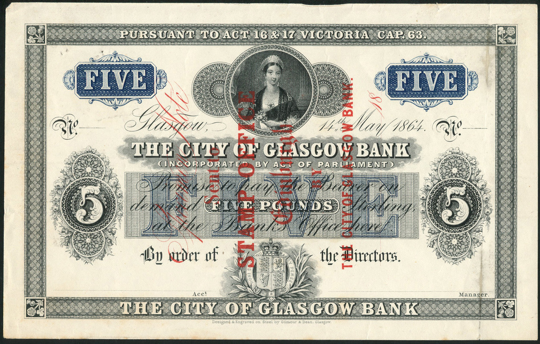 City of Glasgow Bank, proof £5 on thickish paper, 14 May 1864, black and white, value in blue rectangle top left and right, value in blue underprint at centre, circular vignette of Queen Victoria top centre, value at left and right, arms low centre, reverse blue, arms