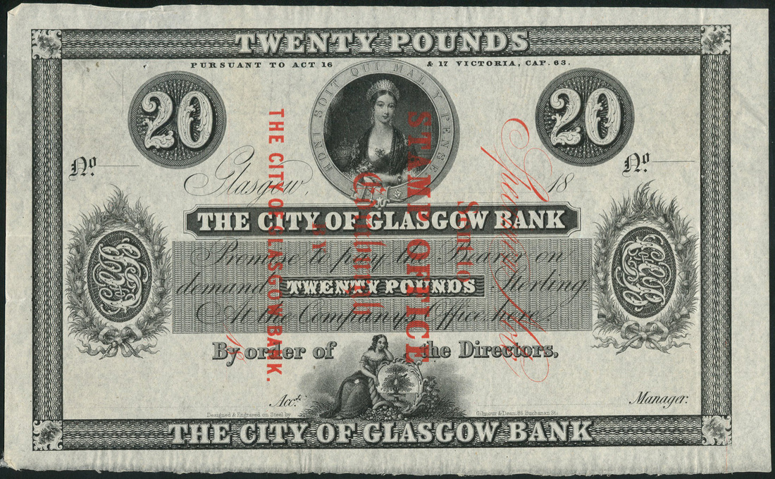 (Douglas 4 for type), red overprint 'SPECIMEN NOTE SENT TO STAMP OFFICE, EDINBURGH, BY THE CITY OF GLASGOW BANK 18-'. Extremely fine, attractive and very rare