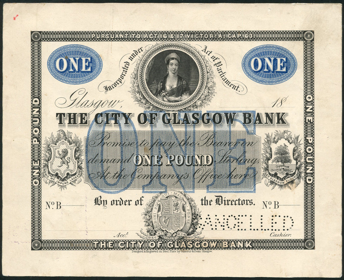 City of Glasgow Bank, proof £1 on thin card, 18- (ca 1866), black and white, value in blue oval top left and right, value in blue underprint at centre, circular vignette of Queen Victoria top centre, arms left and right centre and low centre, plate B