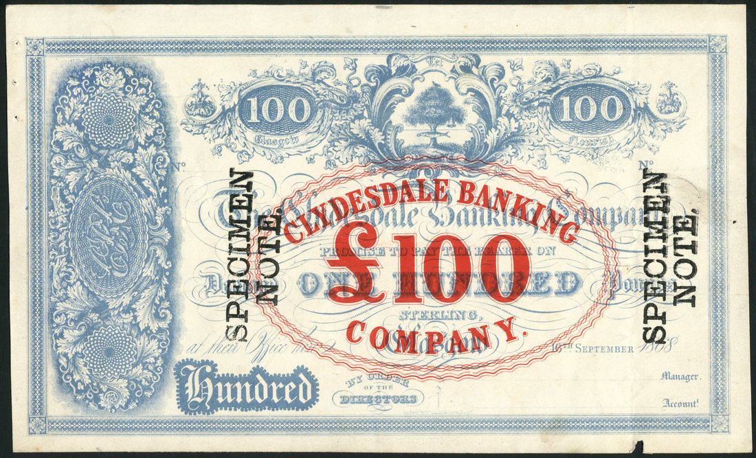 Clydesdale Banking Company, proof £100 on thin card, 16 September 1868, pale blue and white, value in pale blue ovals top left and right and in underprint low centre, Bank name and value in red oval frame at centre, arms top centre, bank initials at left, imprint W & A K Johnston