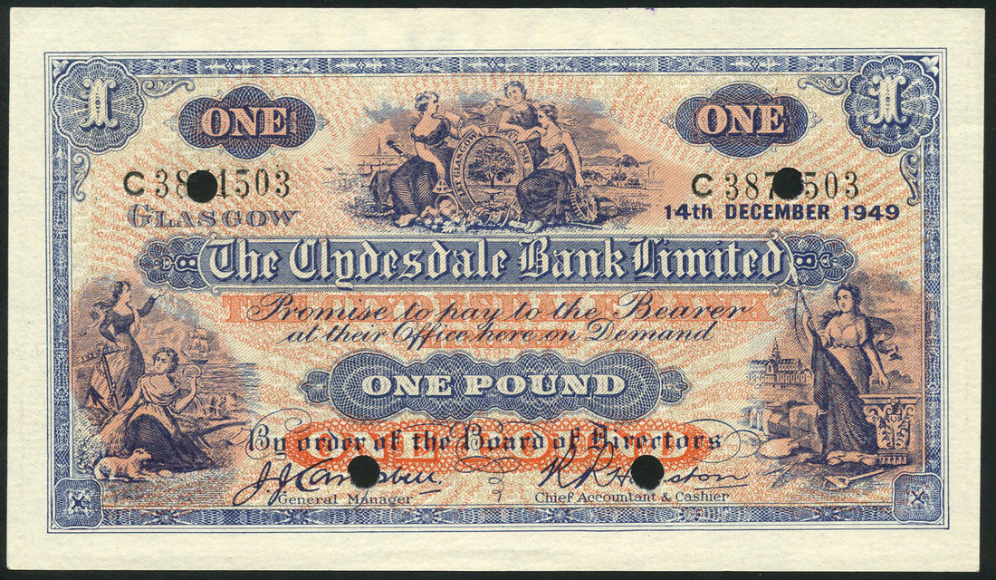 Clydesdale Bank Limited, £1, 14 December 1949, serial number C 3871503, blue and red, maidens and arms top centre, maidens low left and right, Campbell and Houston signatures, reverse blue, arms and value