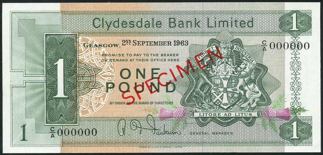 Clydesdale Bank Limited, specimen £1, 2 September 1963, serial number C/A 000000, green and pale orange, arms at right, value at left, Fairbairn signature, reverse green, ships