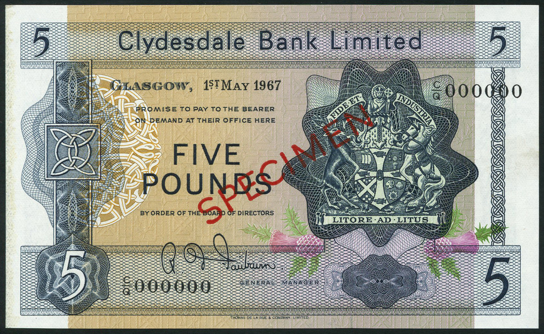 Clydesdale Bank Limited, £5, 1 May 1967, serial number C/Q 000000, dark blue on multicolour underprint, ornate column at left, bank arms at right, value in each corner and at centre, Fairbairn signature, reverse, King's College, Aberdeen