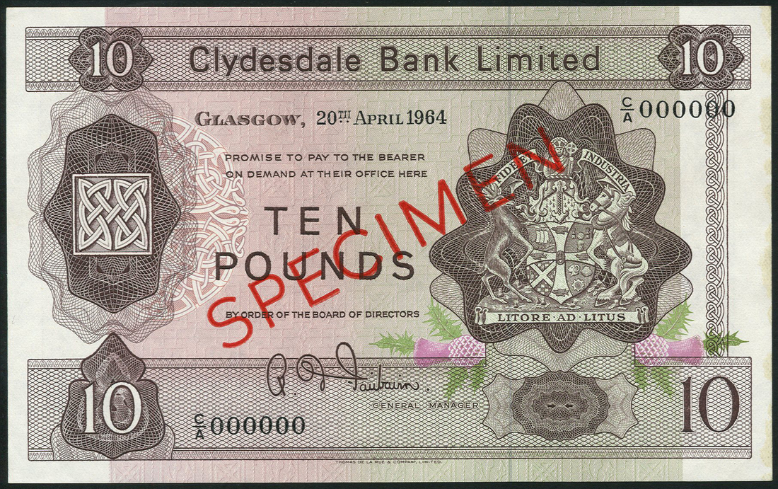 Clydesdale Bank Limited, £10, 20 April 1964, serial number C/A 000000, brown on multicolour underprint, bank title top centre, value in each corner and at centre, arms at right, ornate column at left, Fairbairn signature, reverse, University of Glasgow