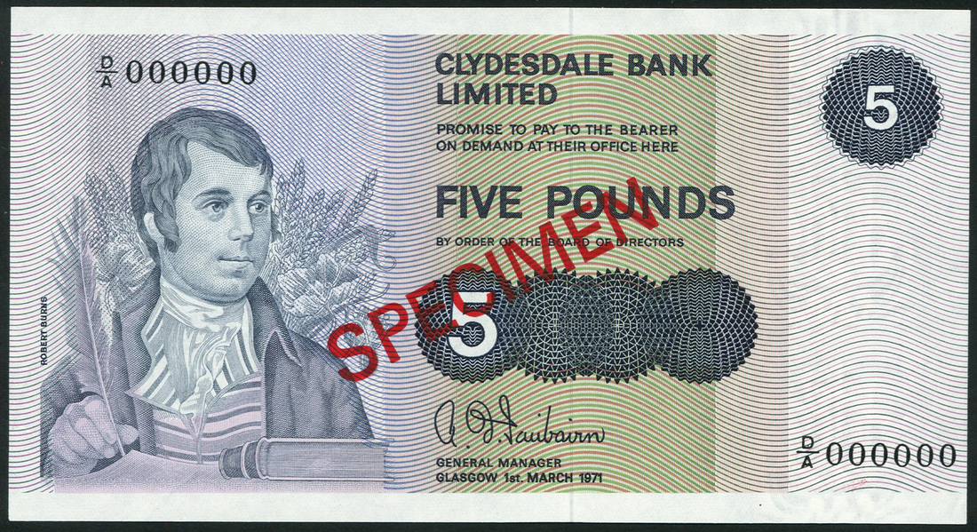 Clydesdale Bank Limited, specimen £1, 1 March 1971, serial number D/A 000000, green and lilac, Robert the Bruce at left, Fairbairn signature, reverse green, also a specimen £5, 1 March 1971, serial number D/A 000000, blue, Robert Burns at left, also an issued example of a £5 dated 1997, as previous but smaller format and Goodwin signature