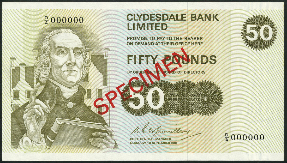 Clydesdale Bank Limited, specimen £50, 1 September 1981, serial number D/A/ 000000, green, Adam Smith at left, MacMillan signature, reverse green, allegorical symbols