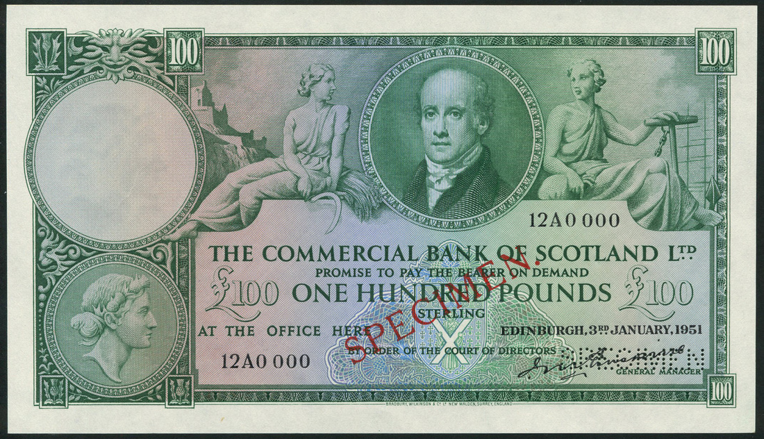 Commercial Bank of Scotland Ltd, specimen £100, 3 January 1951, serial number 12A 00000, green and blue and mauve, Lord Cockburn top right, maidens representing Agriculture and Commerce top left and right, Scotia low left, Erskine signature, reverse, green
