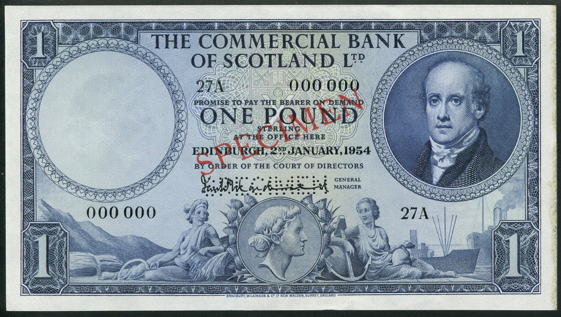 Commercial Bank of Scotland Ltd, specimen £1, 2 January 1954, serial number 27A 000000, blue and multicoloured, Lord Cockburn at right, maidens representing Scotia, Agriculture and Commerce low centre, Erskine signature, reverse blue