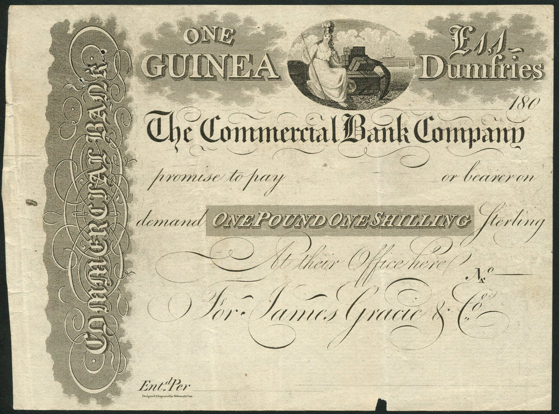 Dumfries Commercial Bank, unissued £1 one shilling, 180-, black and white, Scotia and symbols of commerce in oval frame top centre, bank title at left, for James Gracie & Co.