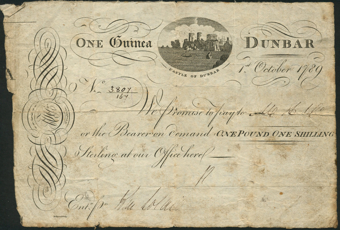 Dunbar Bank, 1 guinea, 1 October 1789, serial number 3807/167, black and white, view of Castle Dunbar in oval frame top centre, bank initials at left, one manuscript signature below