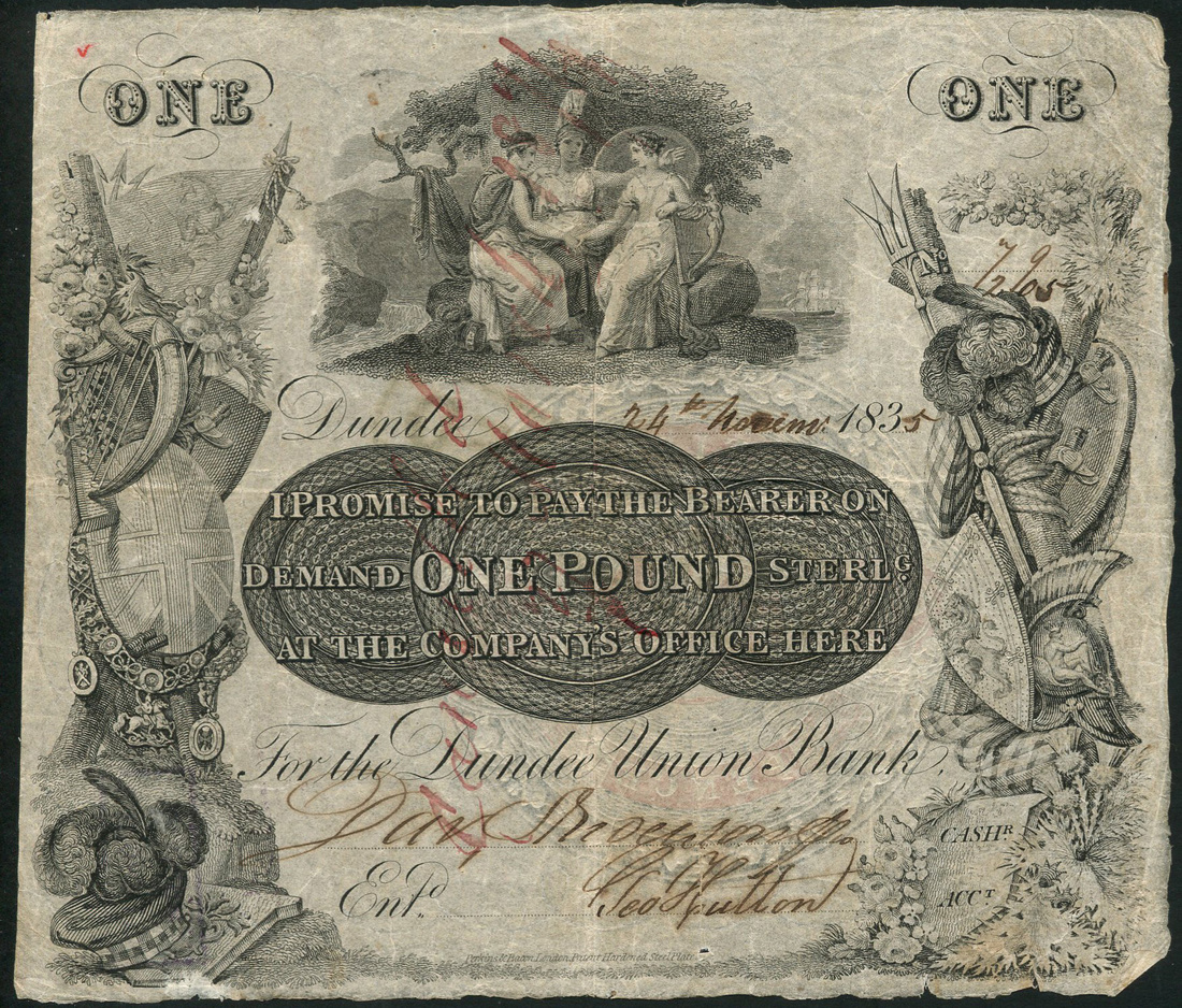 Dundee Union Bank, £1, 24 November 1835, serial number 79/205, black and white, the Three Graces top centre, allegorical symbols at left and right, two manuscript signatures low centre