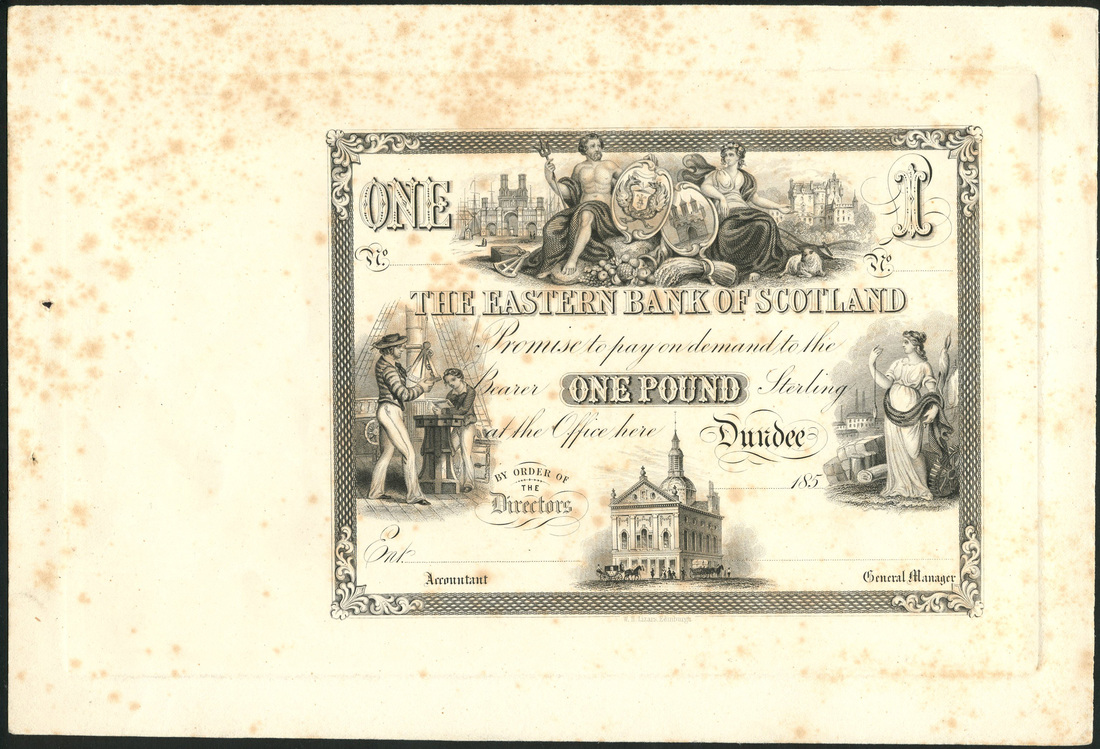 Eastern Bank of Scotland, proof £1 on large format card, 185- (ca 1850), black and white, arms and allegorical figures top centre, sailors at left, maiden (Industry) at right, the Trades Hall, Dundee, low centre