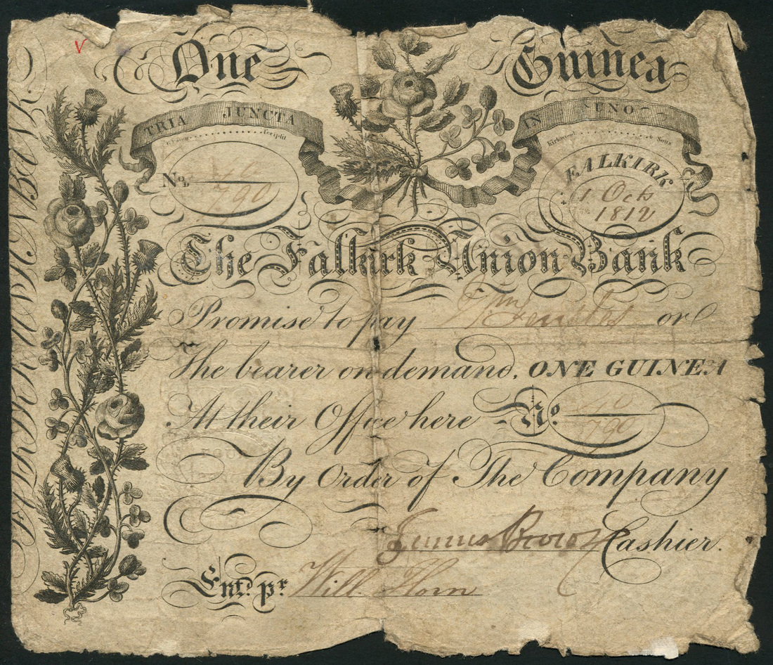 Falkirk Union Bank, one guinea, 1 October 1812, serial number 40/790, black and white, rose, thistle and shamrock top centre, border of thistles at left, two manuscript signatures below