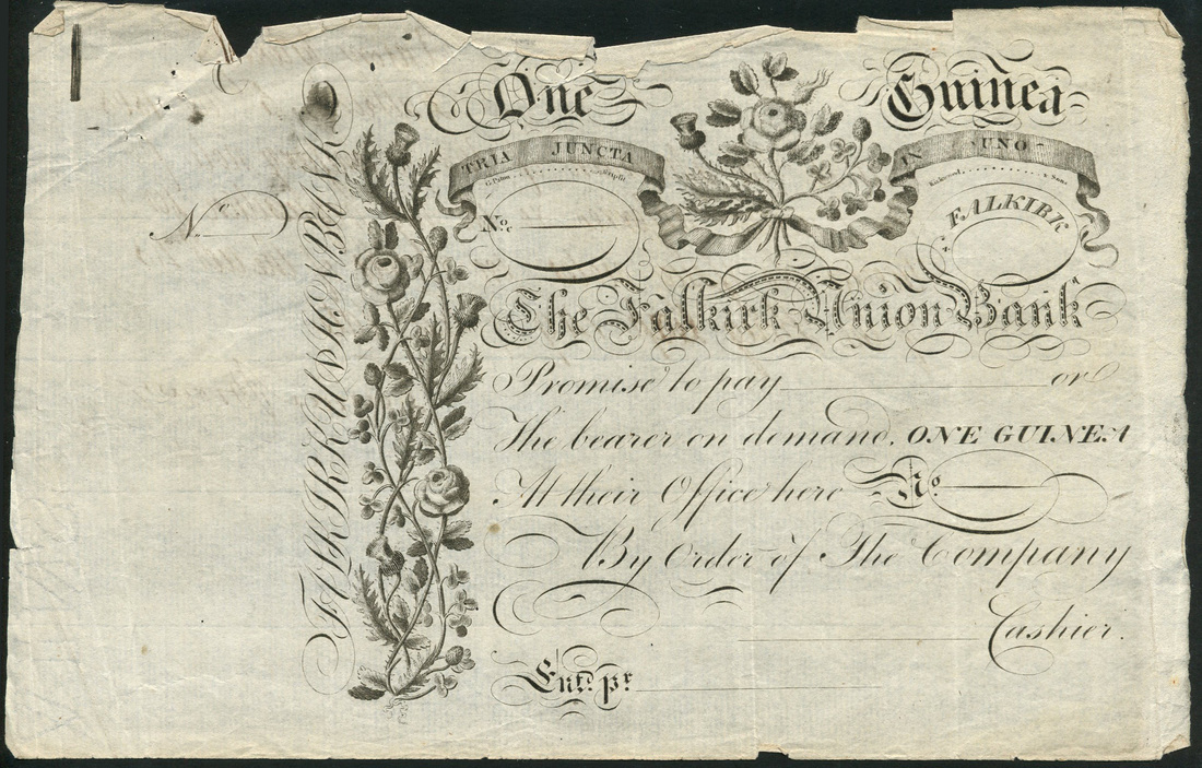 Falkirk Union Bank, one guinea, ND (ca 1803), black and white, rose, thistle and shamrock top centre, border of thistles at left, large border at left