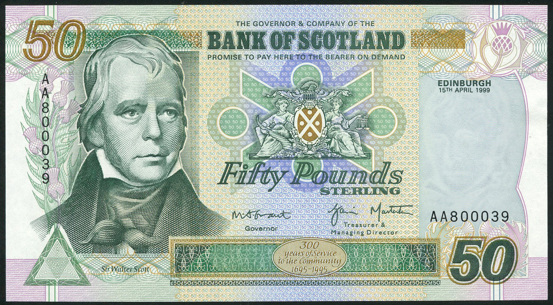 Bank of Scotland, £50 (2), 1995, serial number AA 001129 and 1999, serial number AA 800039, green, Sir Walter Scott at left, arms at centre, Pattullo and Burt signature and Grant and Masterton signatures