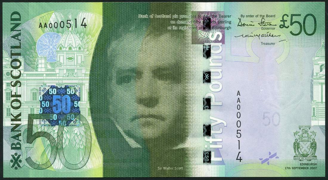 Bank of Scotland, £50 (2), 17 September 2007, serial numbers AA 000514 and ZZ 006029, green, Sir Walter Scott at centre, reverse green, falkirk wheel at centre
