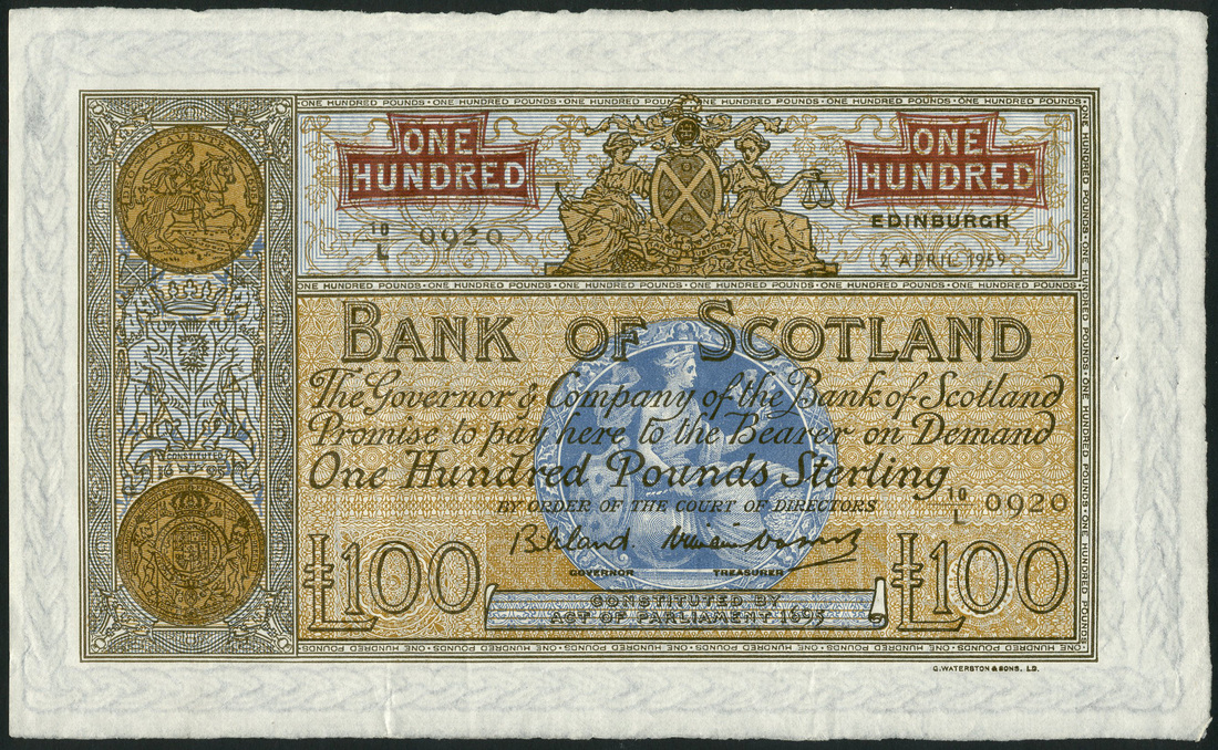 Bank of Scotland, £100, 2 April 1959, serial number 10/L 0920, pale brown and orange, blue circular vignette of Scotia at centre, arms top centre, arms at left, value in red panel top left and right, Bilsland and Watson signatures