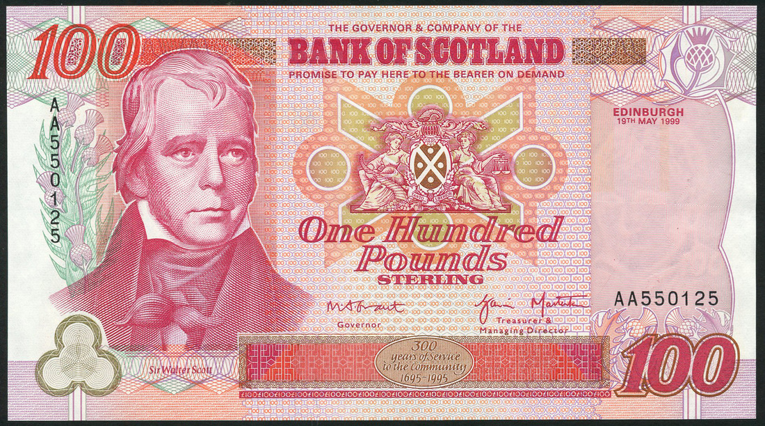 Bank of Scotland, £100 (2), 1999, serial number AA 550125/849869, red, Sir Walter Scott at left, arms at centre, Grant and Masterton signatures