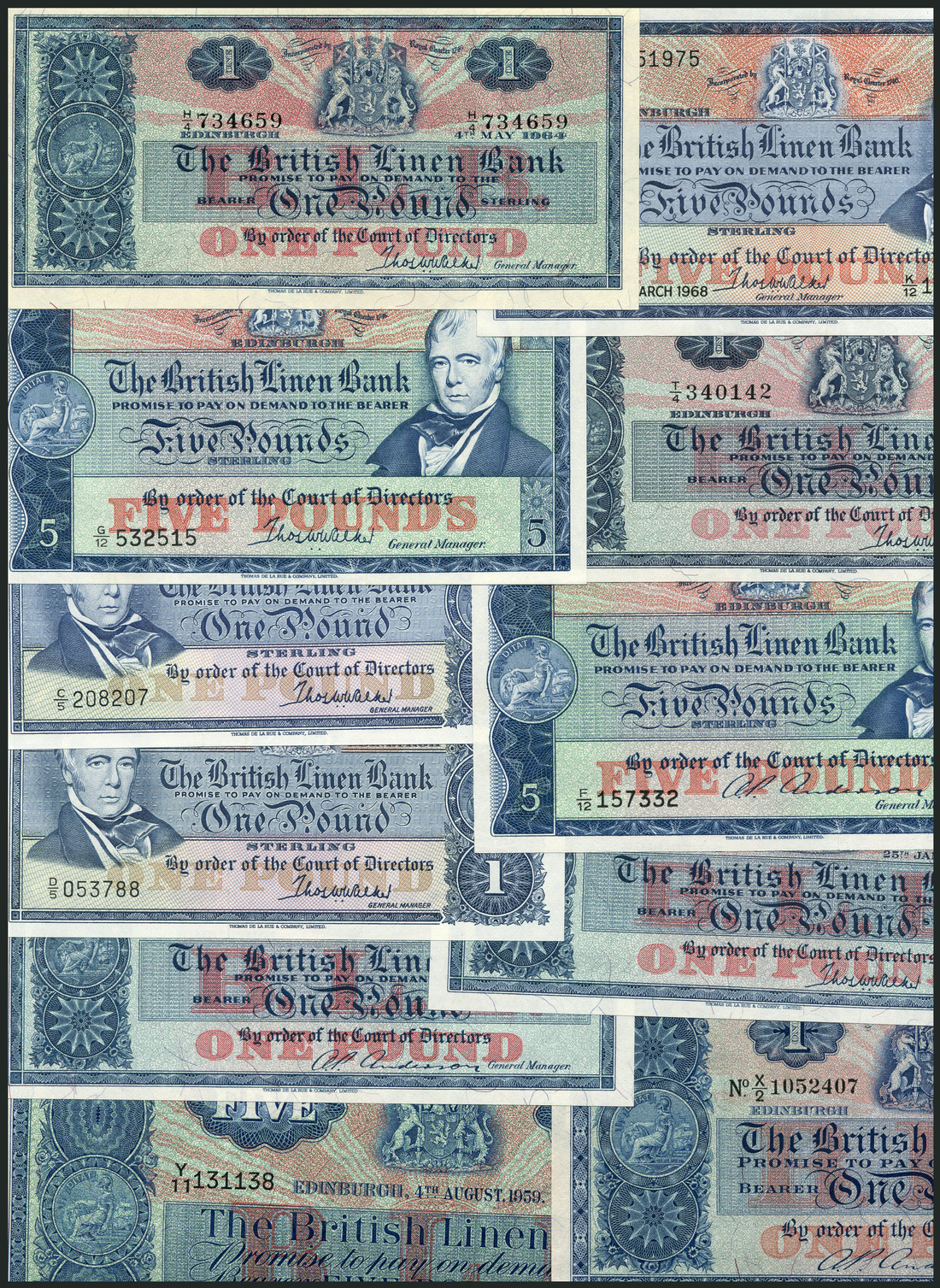 British Linen Bank, £1 (8), 1946, prefix X/1, Mackenzie signature, 1955, prefix X/2, 1962, prefix V/3, Anderson signature, 1964, prefix H/4, 1966, prefix M/4, 1967, prefix T/4, 1969, prefix C/5, 1970, prefix D/5, Walker signature, £5 (4), 1959, prefix Y/11, 1962, prefix F/12, Anderson signature, 1964, prefix G/12, 1968, prefix K/12, Walker signature