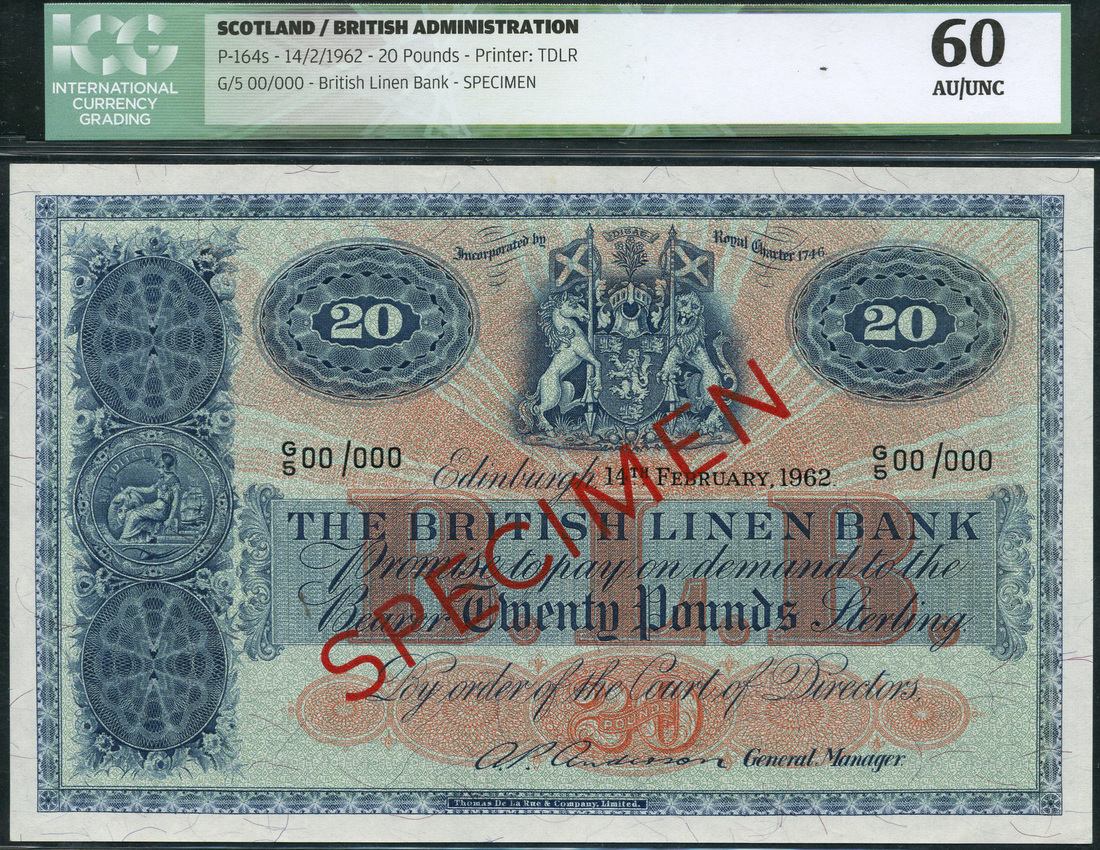 British Linen Bank, specimen £20, 14 February 1962, serial number G5 00/000 blue on light green and red sunburst underprint, arms top centre flanked by value in ornate tablets, DITAT emblem in panel at left, red B.L.B at centre, Anderson signature, reverse, DITAT emblem at centre within elaborate blue panel