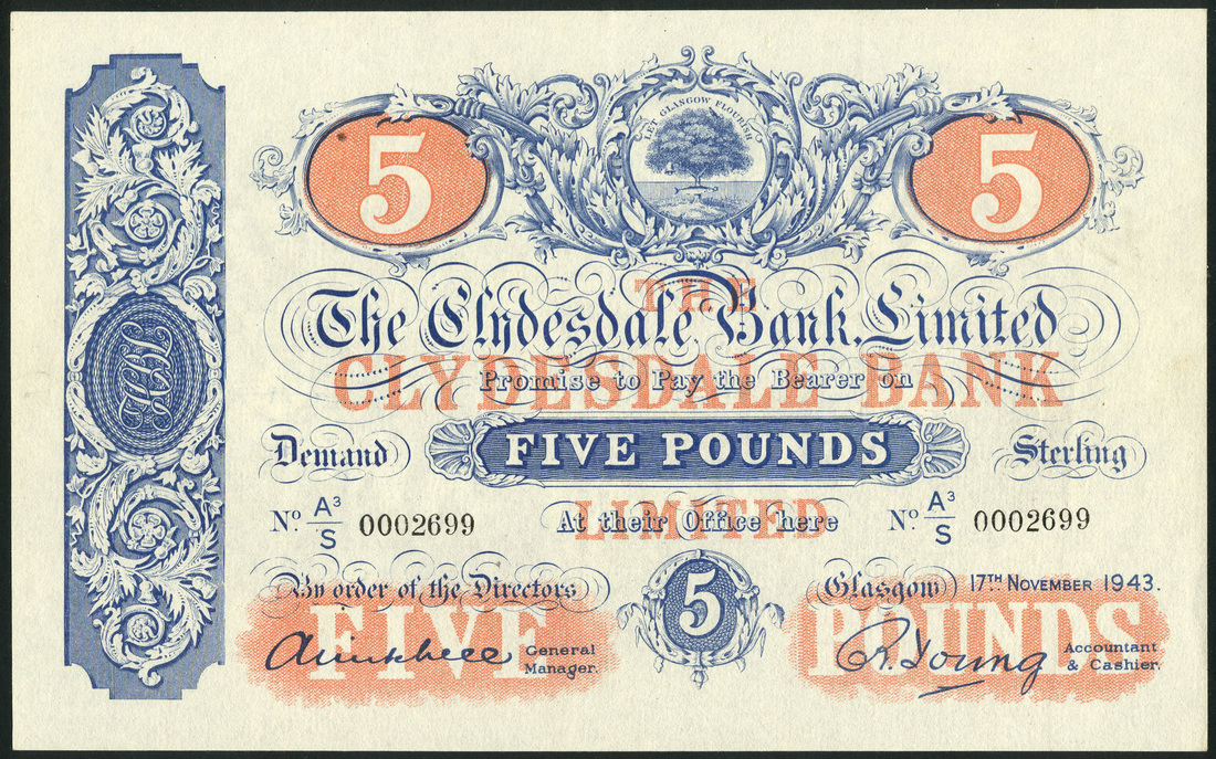 Clydesdale Bank Limited, £5, 17 November 1943, serial number A3/S 0002699, blue and red, Glasgow coat of arms flanked by value in red tablets at top centre, ornate panel at left, Mitchell/Young signature, reverse, arms at centre flanked by value in ornate guilloche pattern