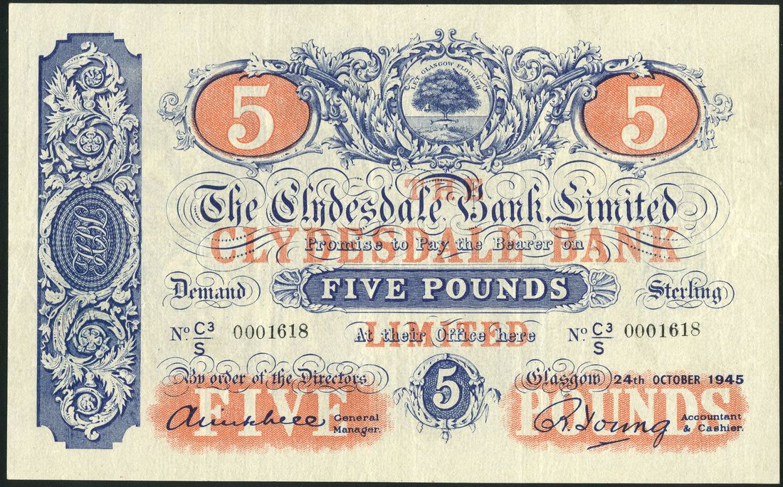 Clydesdale Bank Limited, £5, 24 October 1945, serial number C3/S 0001618, blue and red, Glasgow coat of arms flanked by value in red tablets at top centre, ornate panel at left, Mitchell/Young signature, reverse, arms at centre flanked by value in ornate guilloche pattern