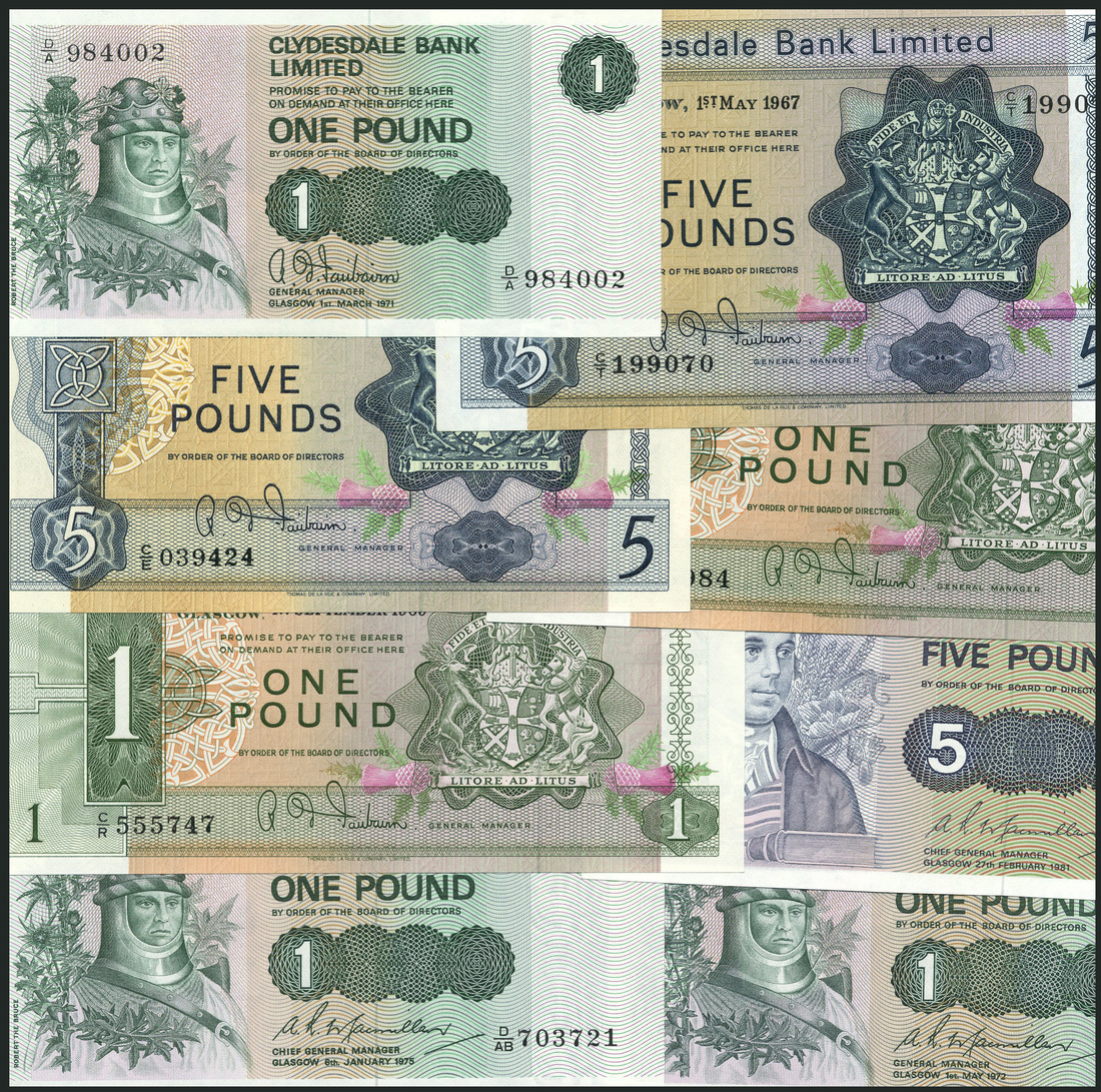 Clydesdale Bank Limited, £1 (2), 1966, serial number C/G 435984, 1969, serial number C/R 555747, green on multicolour, £5 (2), 1963, serial number C/E 039424, 1967, serial number C/T 199070, blue on multicolour, both with arms at right and R.D Fairbairn signature, £1, 1971, prefix D/A, R.D Fairbain signature, 1972, D/K, 1975, D/AB £5, 1981, prefix D/DL, Mac Millan signature