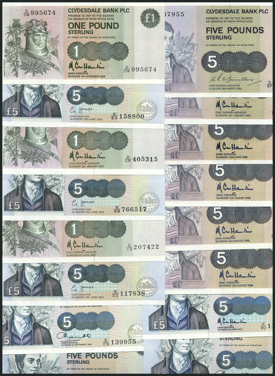 Clydesdale Bank Plc, £5, 1982, prefix D/EF, MacMillan signature, 1983, prefix D/FV, 1989, prefix D/LU, 1988, consecutive trio D/KV 050983-5, 1990, prefix E/BU, A.R Hamilton, 1994 (2), prefix E/CS, Cicutto signature, 1996 (6), prefixes E/DS, R/B, R.Goodwin signature, 2002, prefixes E/DZ, E/EB, E/EA, all blue, Robert Burns at left, £1 (3), 1983, D/CR, 1985, D/CS, 1988, D/DW, with A.C. Hamilton signature, green Robert the Bruce at left