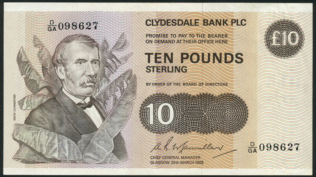 Clydesdale Bank Plc, 310, 20 March 1992, serial number D/GA 098627, brown on lilac and ornage, David Livingstone at left, Mac Millian signature