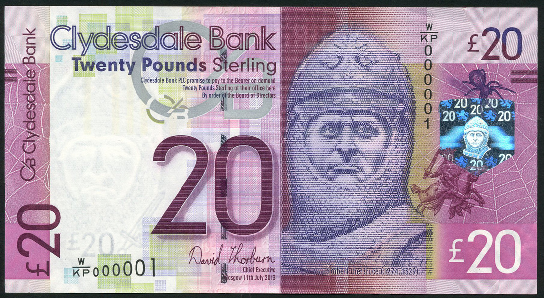 Clydesdale Bank Plc, £10, 25 January 2013, serial number W/KP 000001, brown and multicoloured, Robert Burns at right, reverse brown and green, view of Edinburgh at centre, also £20, 11 July 2013, serial number W/KP 000001, purple and multicoloured, Robert the Bruce at right, reverse purple, Robert the Bruce on horseback, both signed by David Thorburn the Chief Executive