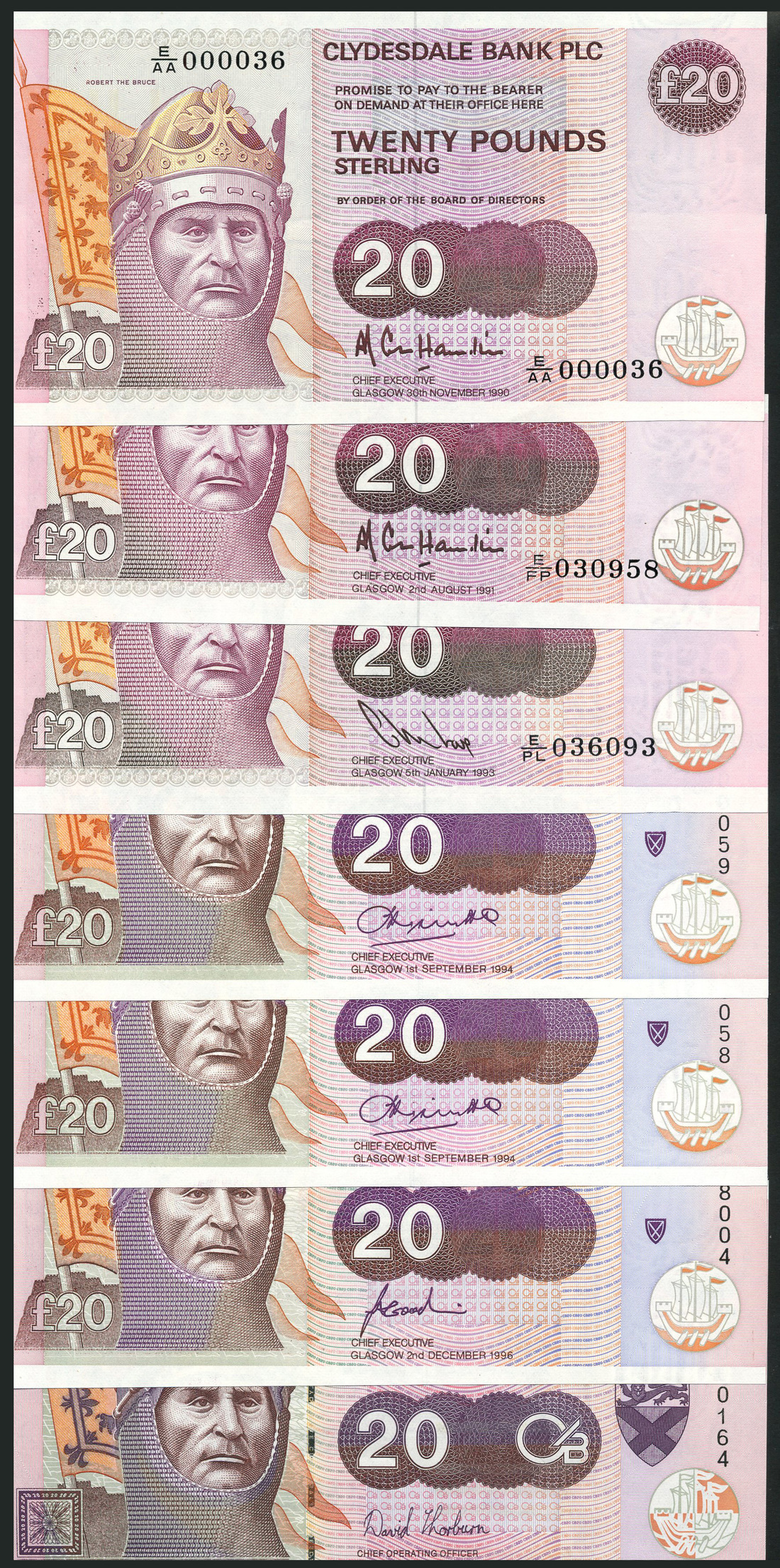 Clydesdale Bank Plc, a group of £20 (6), 1990, serial number E/AA 000036, A.C Hamilton signature, 1991, prefix E/FP, 1993, prefix E/PL, 1994, serial number E/SS 000058-59,1996, F/AZ, 2006 RB/I, all pink and purple, Robert the Bruce