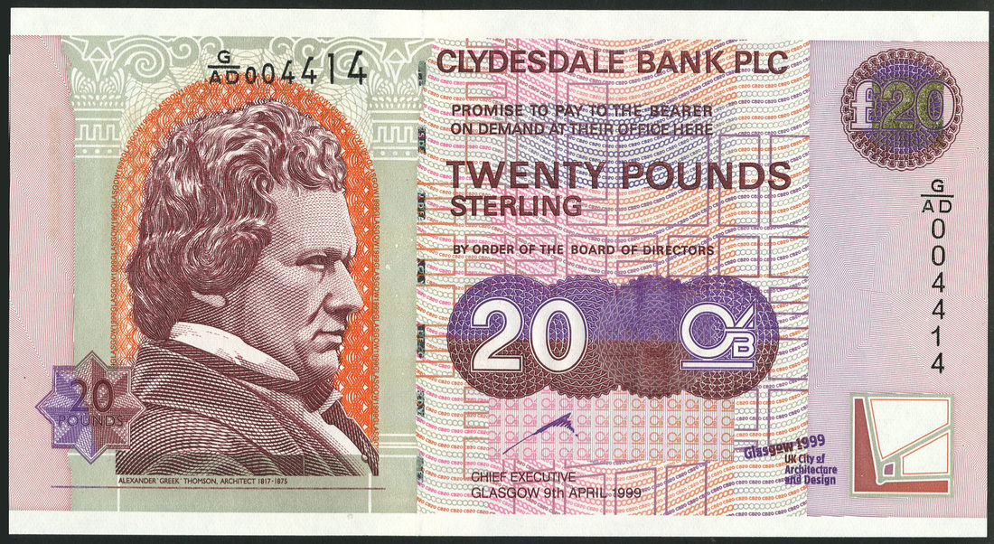 Clydesdale Bank Plc, £20 (4), 1999, serial numbers A/AL 675939, G/AD 004135, G/AD 004414, A/AD 004692, all with Wright serial number, purple, pink and orange, Alexander 'Greek' Thomson at left, commemorative stamp at low right
