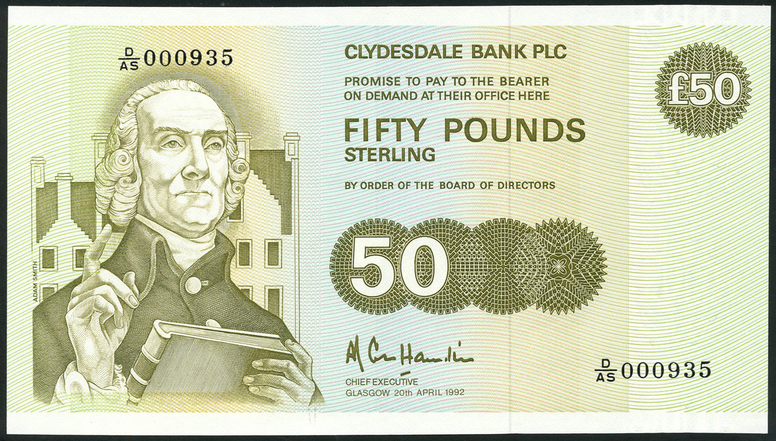 Clydesdale Bank Plc, £50, 3 September 1992, serial number D/AS 000935, olive green, portrait Adam Smith at left, value at centre and top right, reverse, old industrial and agricultural tools, sailing ships in distance, A.R.C Hamilton signature