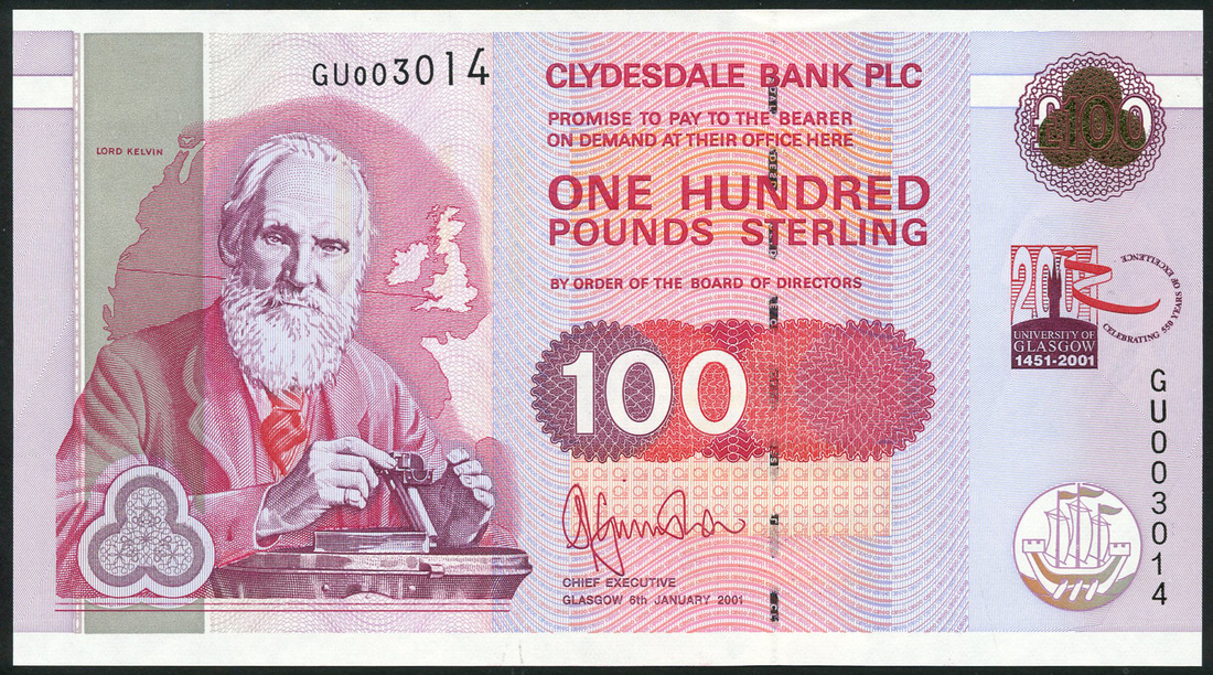 Clydesdale Bank Plc, £50 (3), 2001, serial numbers GU 000040, GU003028, GU003014, green and brown, Adam Smith at left, £100 (2), 2001, serial number GU 003014, GU 003028, pink and purple, Lord Kelvin at left, all with Commemorative seal at right celebrating 550 year of the University of Glasgow