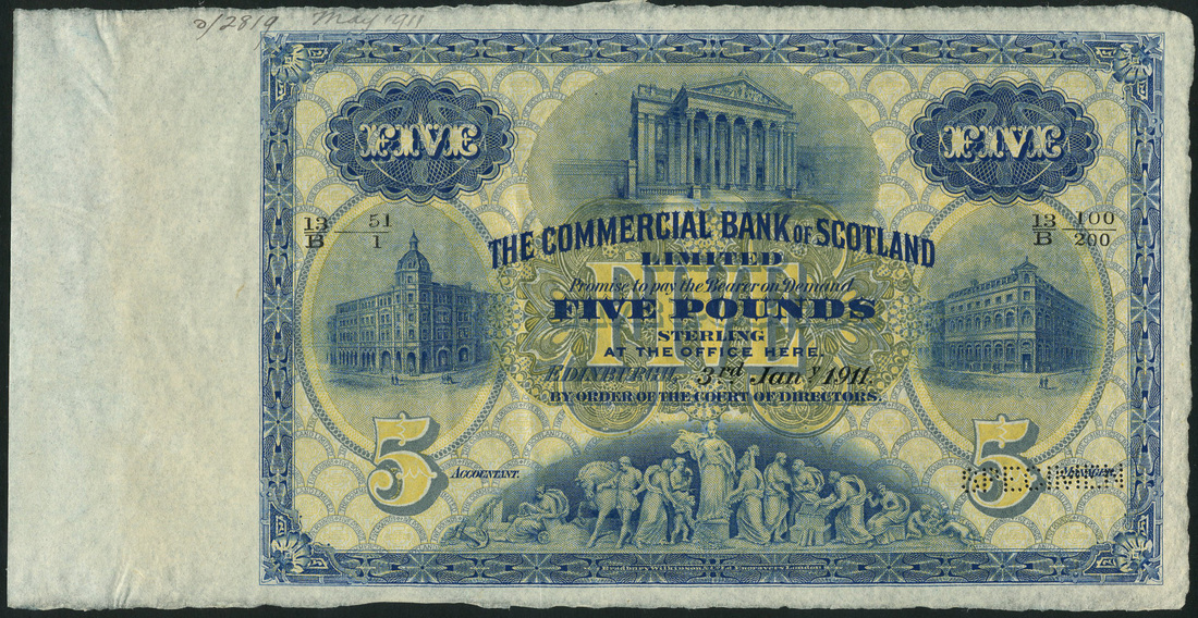 (†) Commercial Bank of Scotland Limited, printer's archival specimen £5, 3 January 1911, serial number run 13/B 51/1 to 13/B 100/200, blue and yellow on buff underprint, vignettes of Glasgow, Edinburgh and London offices of the Bank at left, top centre and right respectively, frieze from Head Office pediment at lower centre, reverse bank seal set in ornate guilloches, perforated SPECIMEN
