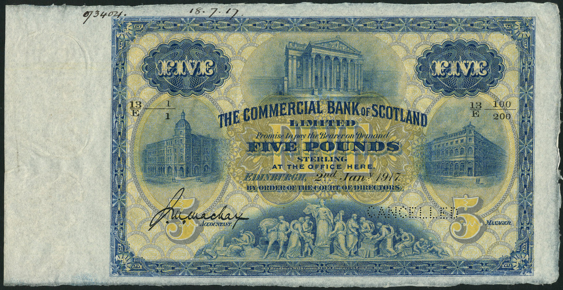 (†) Commercial Bank of Scotland Limited, printer's archival specimen £5, 2 January 1917, serial number run 13/E 1/1 to 13/E 100/200, blue and yellow on buff underprint, vignettes of Glasgow, Edinburgh and London offices of the Bank at left, top centre and right respectively, frieze from Head Office pediment at lower centre, reverse bank seal set in ornate guilloches, perforated CANCELLED