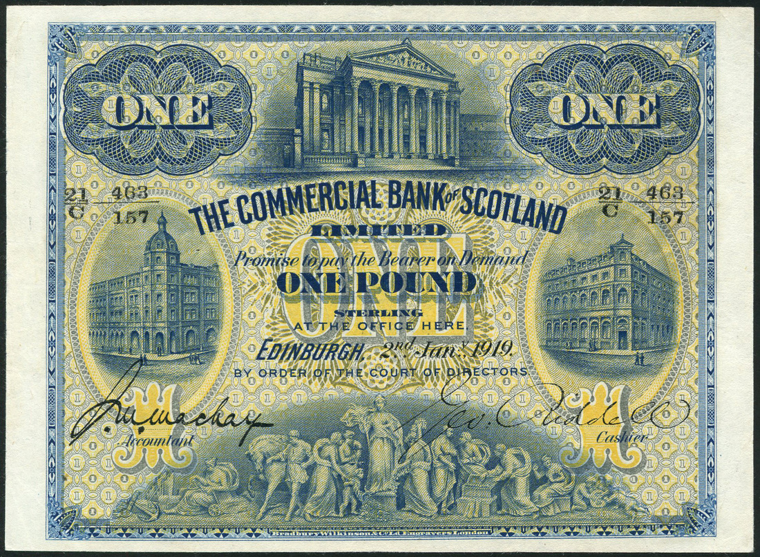 Commercial Bank of Scotland Limited, £1, 2 June 1919, serial number 21C 463/157, blue on yellow and pale blue underprint, depictions of the bank's head offices in Edinburgh, Glasgow and London, frieze along low margin, Mackay/Riddell signature, reverse, bank emblem in ornate guilloche pattern