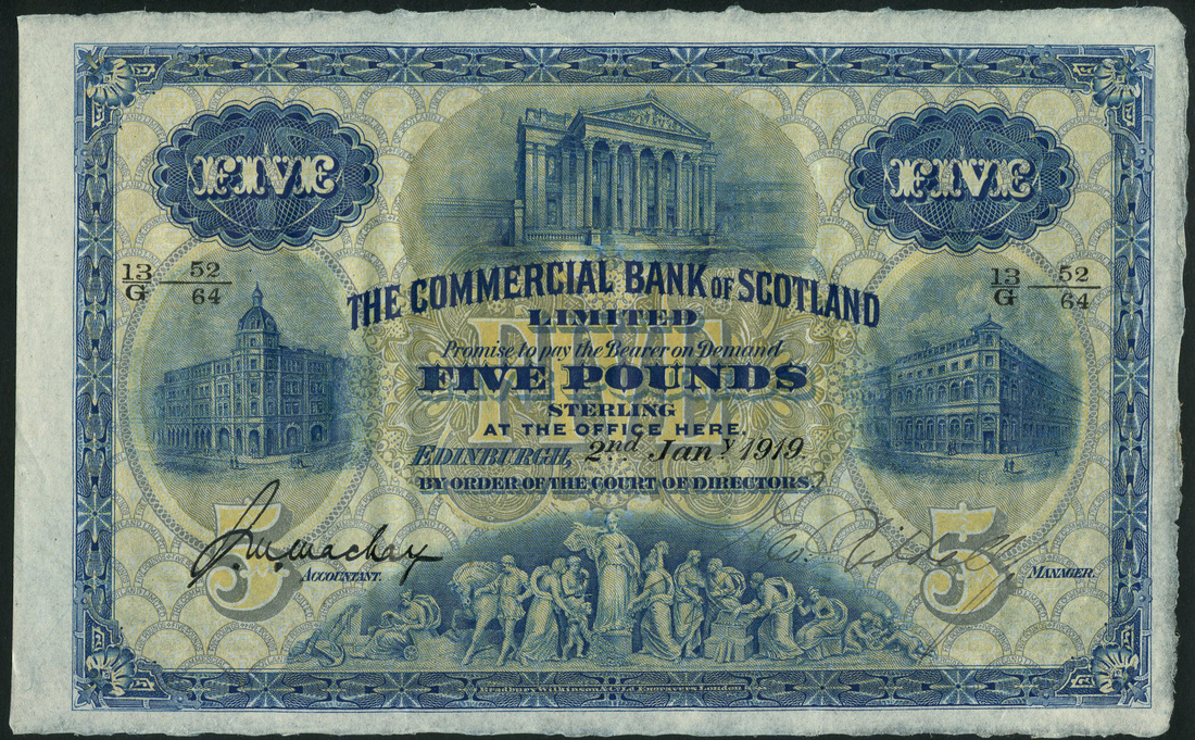 Commercial Bank of Scotland Limited, £5, 2 January 1919, serial number 13/G 52/64, blue and white, bank building top centre and at left and right, classical frieze low centre, Mackay signature, reverse, bank emblem within ornate blue panel, value in each corner