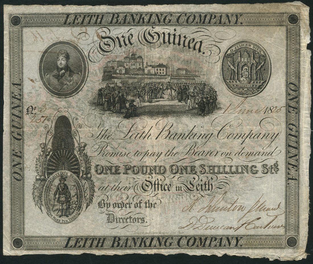 Leith Banking Company, 1 guinea, 1 June 1825, serial number 3/251 black and white, the arrival of George IV in Leith top centre, George IV top left, arms top right, Bonnie Prince Charlie low left, two manuscript signatures low right