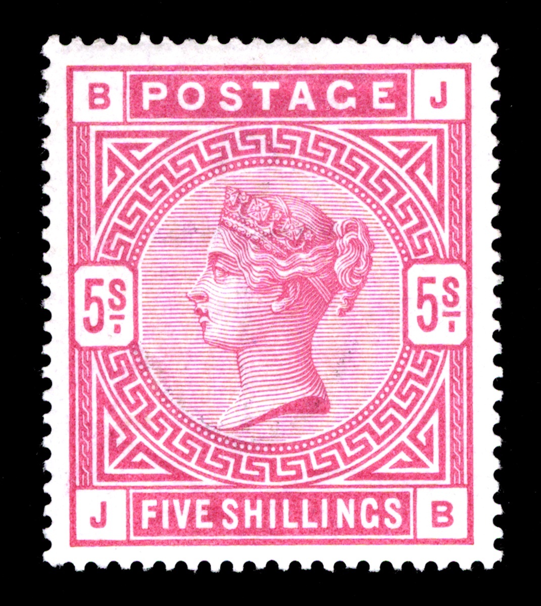 #108, 1884 5/- Carmine rose, vivid rich color on bright paper, o.g., couple typical gum beds, very fine (S.G. #181; £975).
