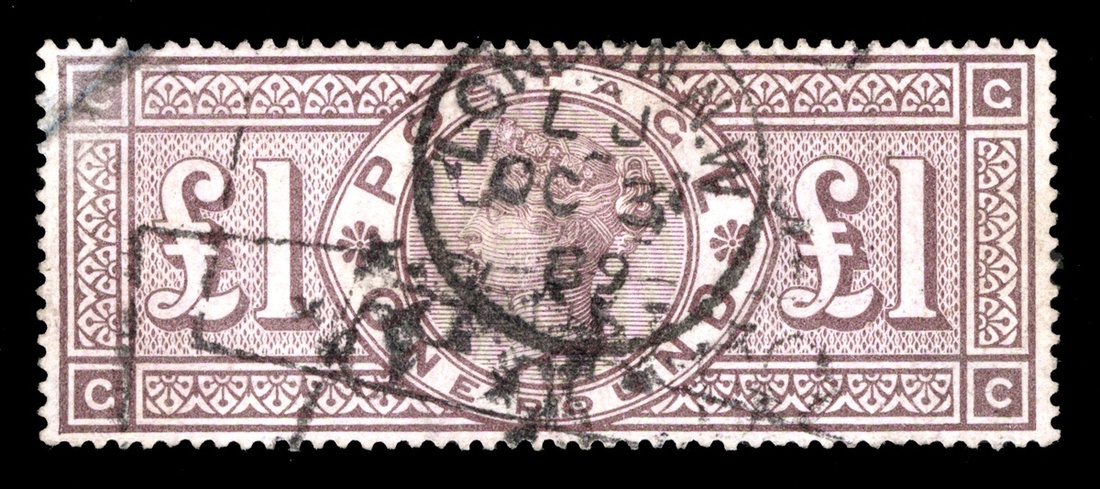 #123, 1888 £1 Brown violet, watermark three orbs, scarce sound used example of this difficult high value, well centered, good color on fresh paper, 1889 London datestamp and usual parcel cancels, very fine (S.G. #186; £4,250).