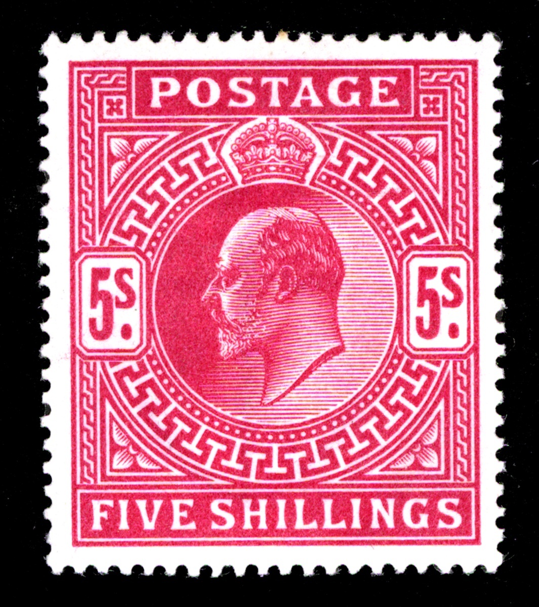 #140a, 1902 5/- Deep bright carmine, choice centering, deep rich color, o.g., l.h., extremely fine (S.G. #264; £450).