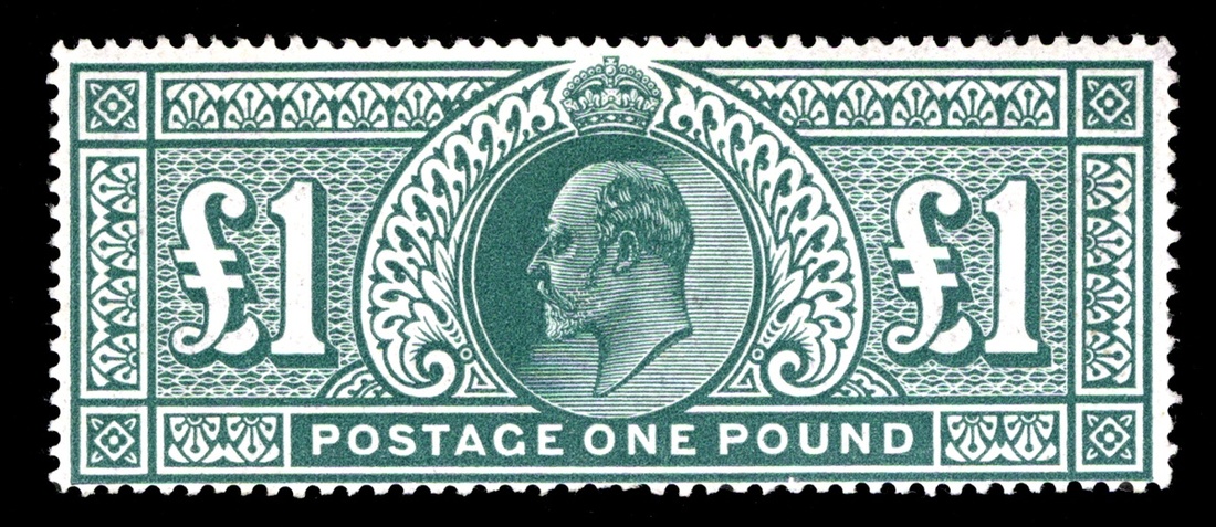 #142a, 1911 £1 Deep green, Somerset House printing, characteristic intense color, o.g., never hinged, fine (S.G. #320; £3,000).