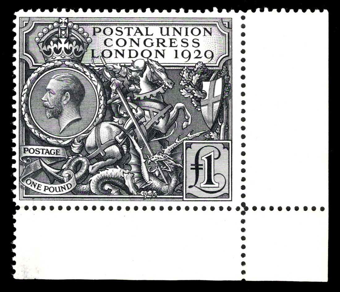#209, 1929 £1 P.U.C., bottom left corner margin single, o.g., hinged in the selvage only, the stamp n.h., very fine (S.G. #438; £1,000).