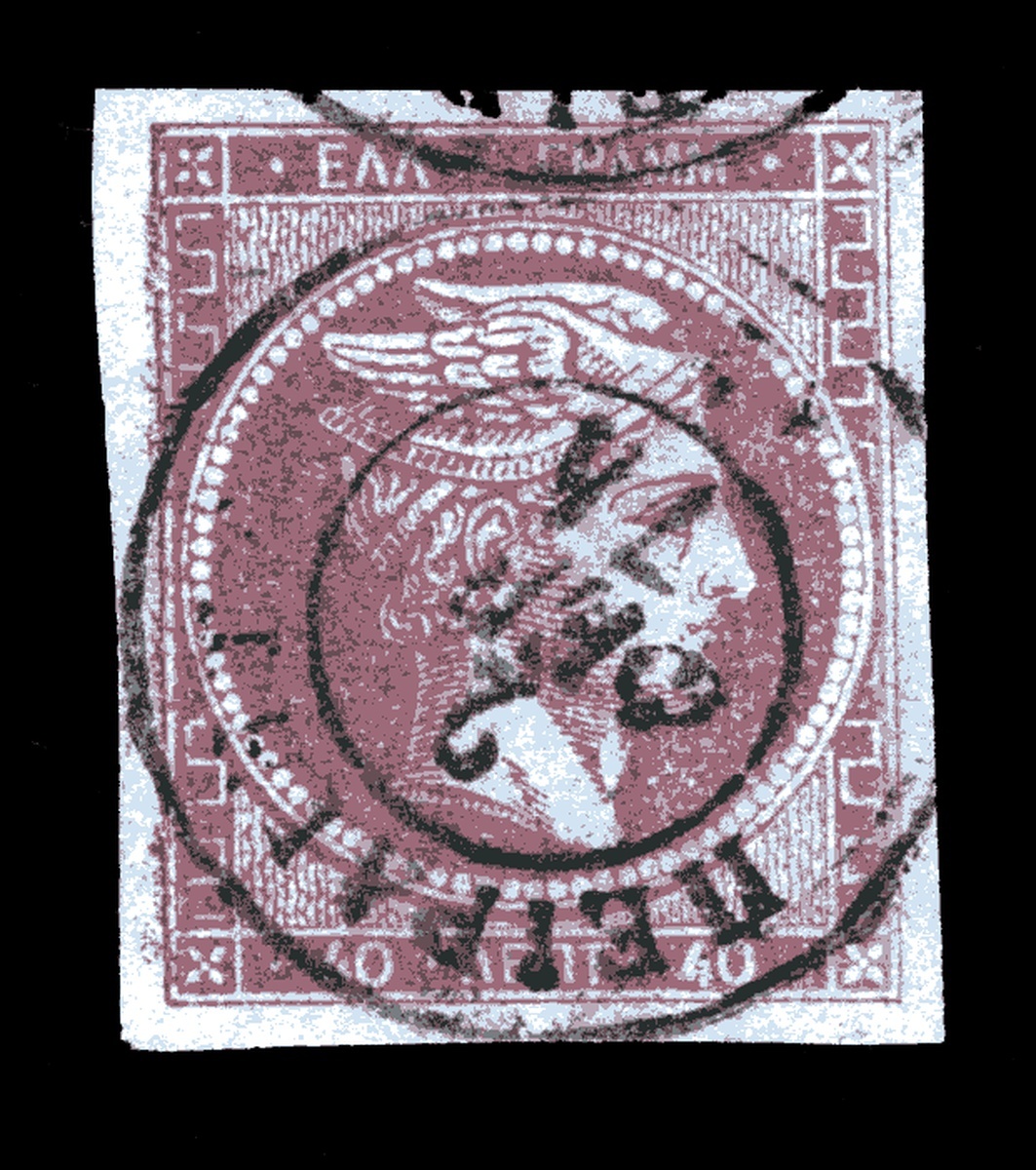 #42b var., 1872 40l Deep bright purple ("Groseille"), choice used example of this rare shade variety, possessing strong characteristic color, large balance margins all around,clear central "Piraeus/(2)/2 Feb. 74"c.d.s. in Greek, extremely fine; a very elusive color variety that is seldom encountered (Hellas #42IId; €800).