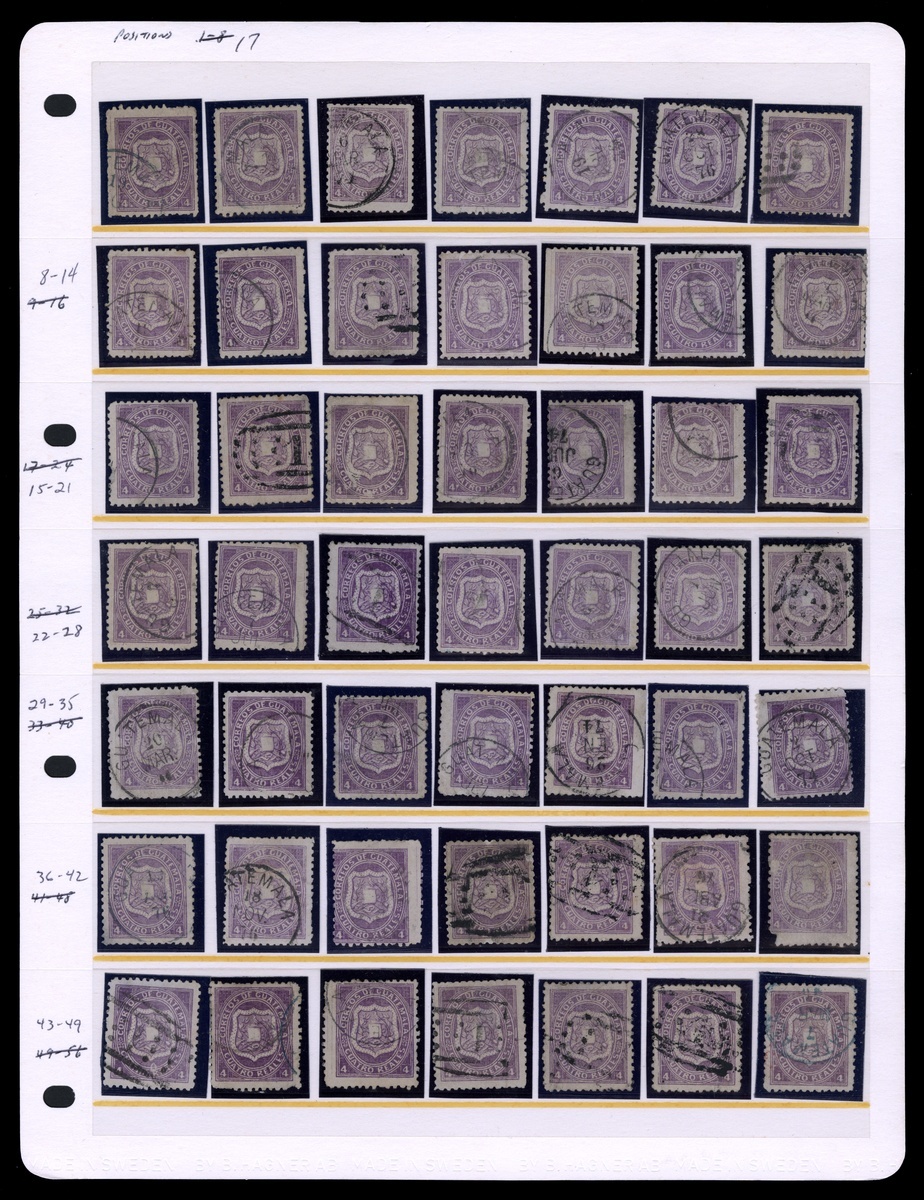 #5, 1873 4r Dull red violet, a complete plating of all 100 subjects arranged on two stockpages, most with Guatemala datestamps or barred oval numeral cancels, mixed condition as is normal for a plating study, however many are sound and fine-very fine; a rare opportunity that would be difficult to duplicate.