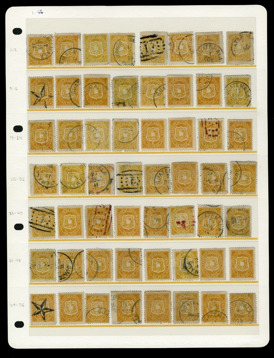 #6, 1873 1P Dull yellow, a complete plating of all 100 subjects comprised of nineteen unused copies (two with o.g.) and 81 used examples, including three with a star cancel and three with red cancels, mixed condition as is to be expected with plating studies, however many are sound and fine-very fine; a rare opportunity.