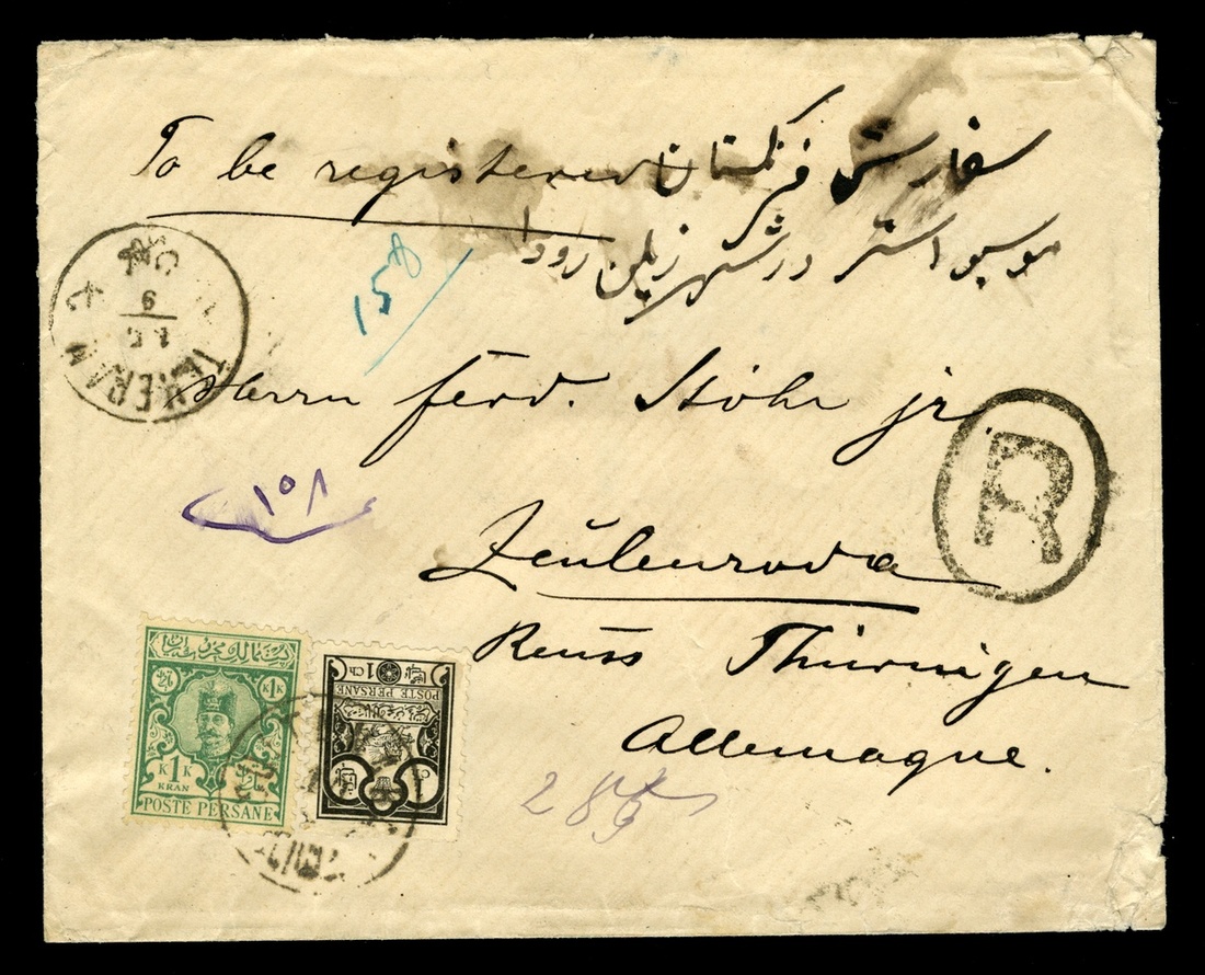 #81, 87, 1891 1c Black and 1K Green, tied to1893 registered foreign mail cover to Zeulenroda in Thuringen, Germany, by "Soitanara 10/9" c.d.s. with Teheran transit of the same date, backstamped on October 14th, small corner flaws to cover at right, not affecting stamps or markings, otherwise a very fine and scarce registered cover.